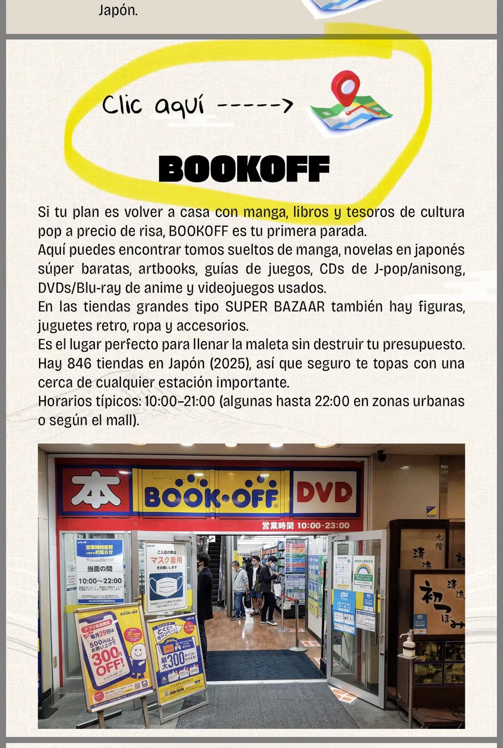 Es mi primera experiencia en Japón. Hace años que sigo el canal de Akira y su pasión por las tiendas de segunda mano me motivó a salir a buscar tesoros en los Hard Off y Book Off. Para eso Google Maps ya no me alcanzaba, así que compré su guía pensando que ofrecería algo más — al menos reseñas breves sobre precios o calidad de los locales.